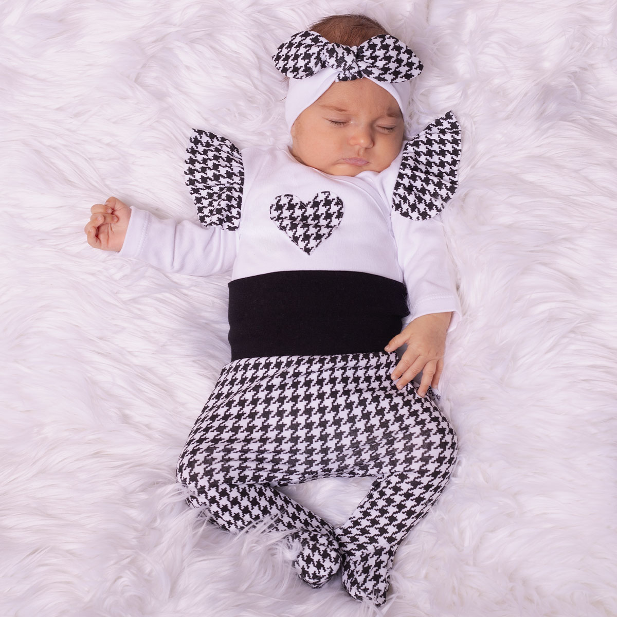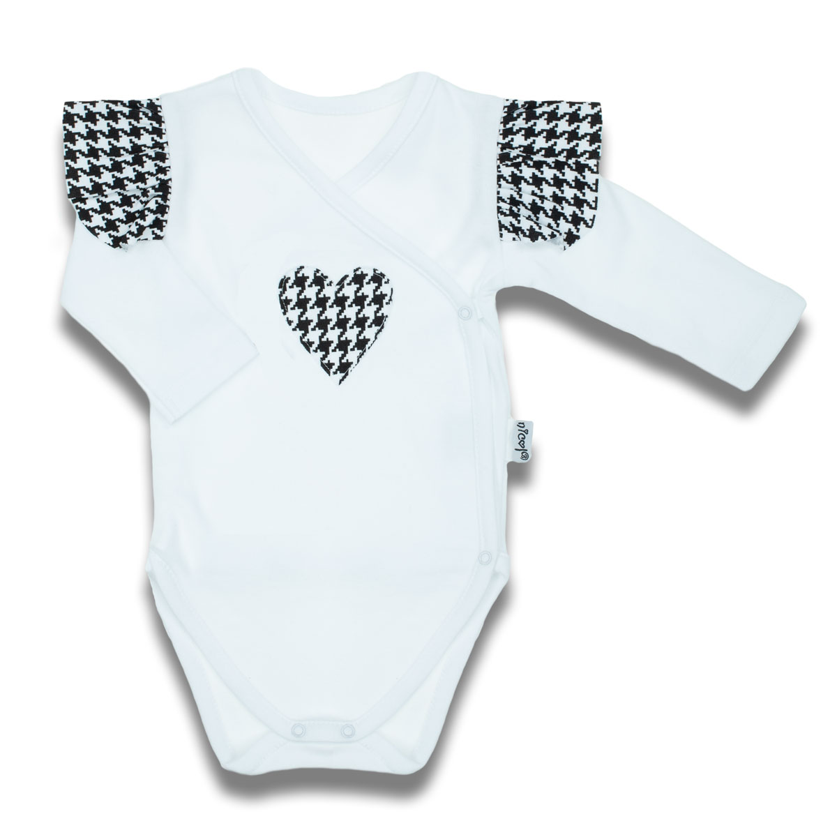 Otroški body belo-črne barve z motivom srca in gumbki, ki omogočajo lažje oblačenje saj se zapenjajo po celotni dolžini.