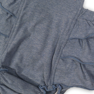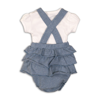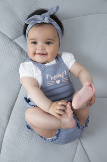 Dvodelni komplet je izdelan iz mehke tkanine. Bela majica ima na levem ramenu dva gumbka, hlačke z naramnicami pa imajo potisk s tekstom “meow”.