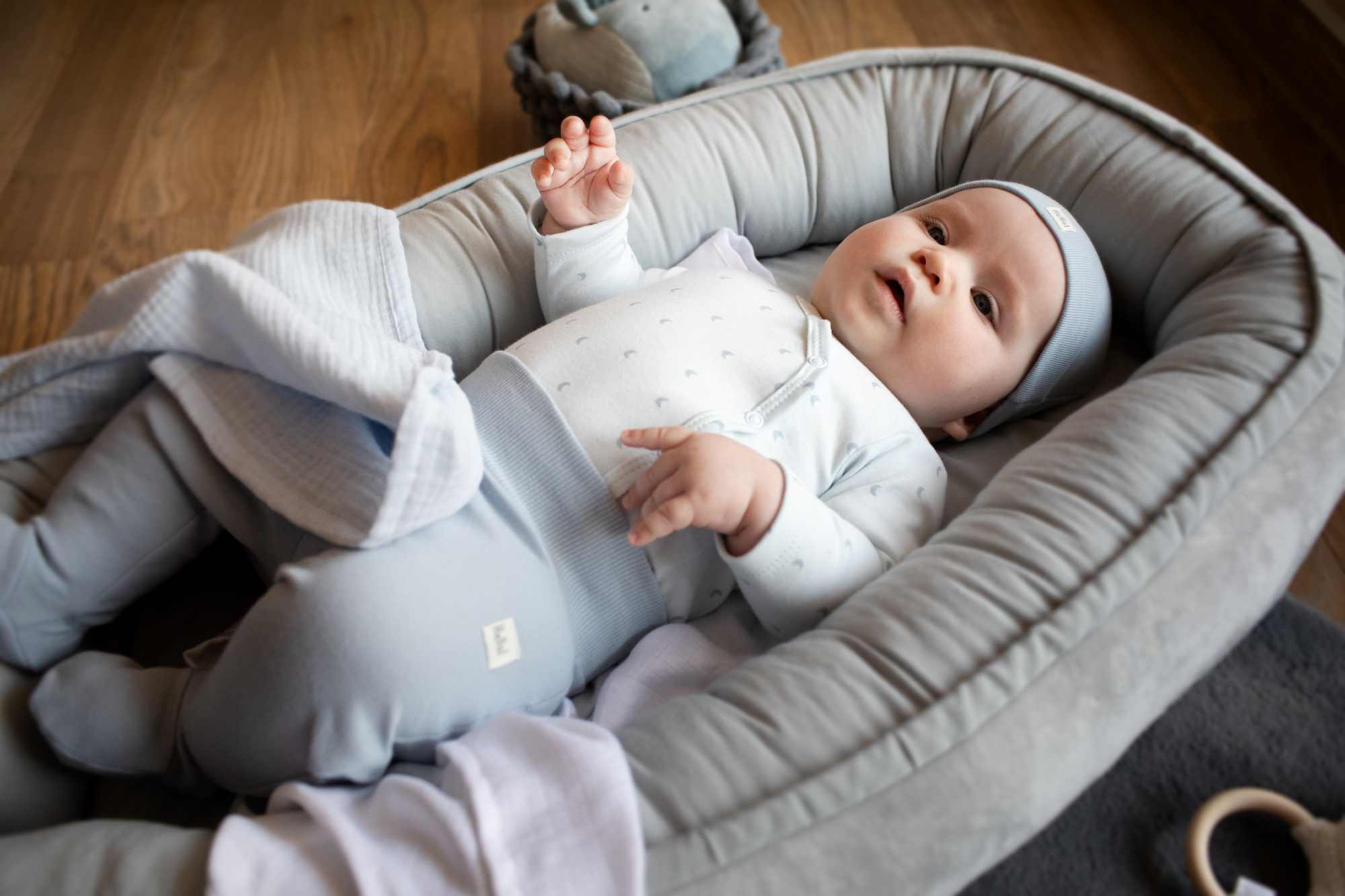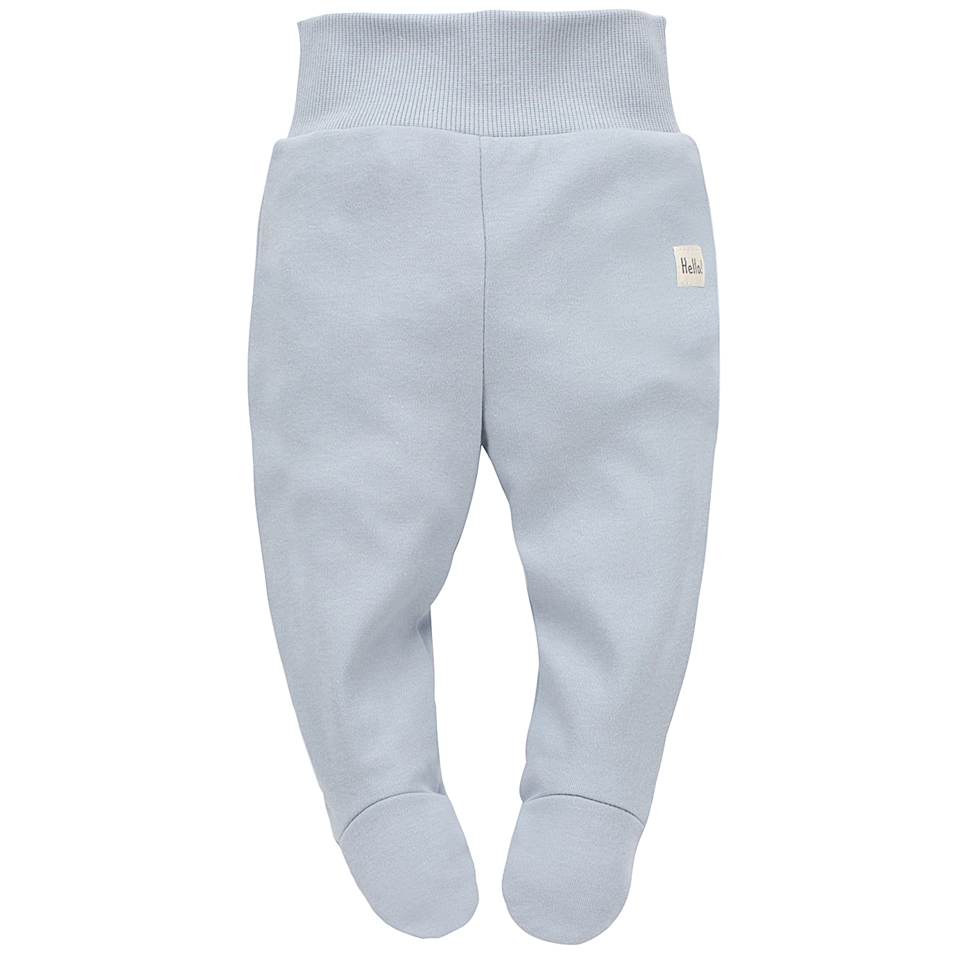 Udobne modre hlače s stopalki. Nepogrešljive pri dojenčkih. Ščitijo njihove nogice pred ohlajanjem. Na levem boku ima našitek Hello. Širok pas drži hlače na svojem mestu, vendar ne stiska trebuščka. Anatomski kroj zagotavlja nemoteno gibanje.